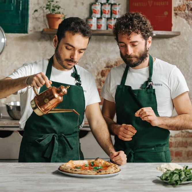 Riccardo y Vittorio, procedentes del mundo del marketing, pero con una pasión extrema por la pizza y la cocina en general, en 2017 abrieron su primer local, Pizzeria Fratelli Figurato, con el objetivo de traer a Madrid la mejor y más ligera pizza napolitana.